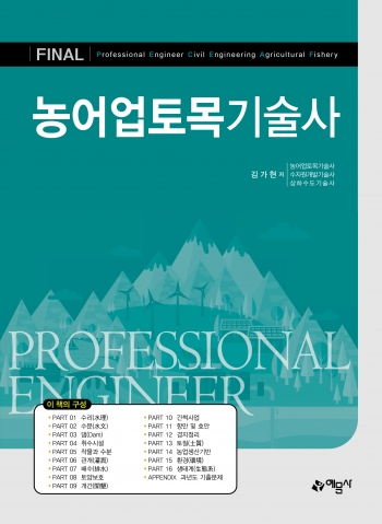 기술사 시험은 자기 자신과의 싸움이므로, 이 싸움을 승리로 이끌기 위해서는 본인의 부단한 노력이 무엇보다 중요하다. 하지만 그 험난한 과정에서 좋은 책의 도움은 매우 큰 역할을 하게 되므로 본서는 그 역할을 다하기 위해 최선의 노력을 다하였다. 그러나 집필을 마무리하고 보니 미진한 부분이 없지 않다. 이러한 부분에 대해서는 지속적으로 수정·보완할 것이다. 독자들의 애정어린 관심과 충고를 기대하며, 모쪼록 기술계의 꽃인 농어업토목 기술사 시험을 준비하는 분들께 이 책이 도움이 되기를 바라는 마음 간절하다.